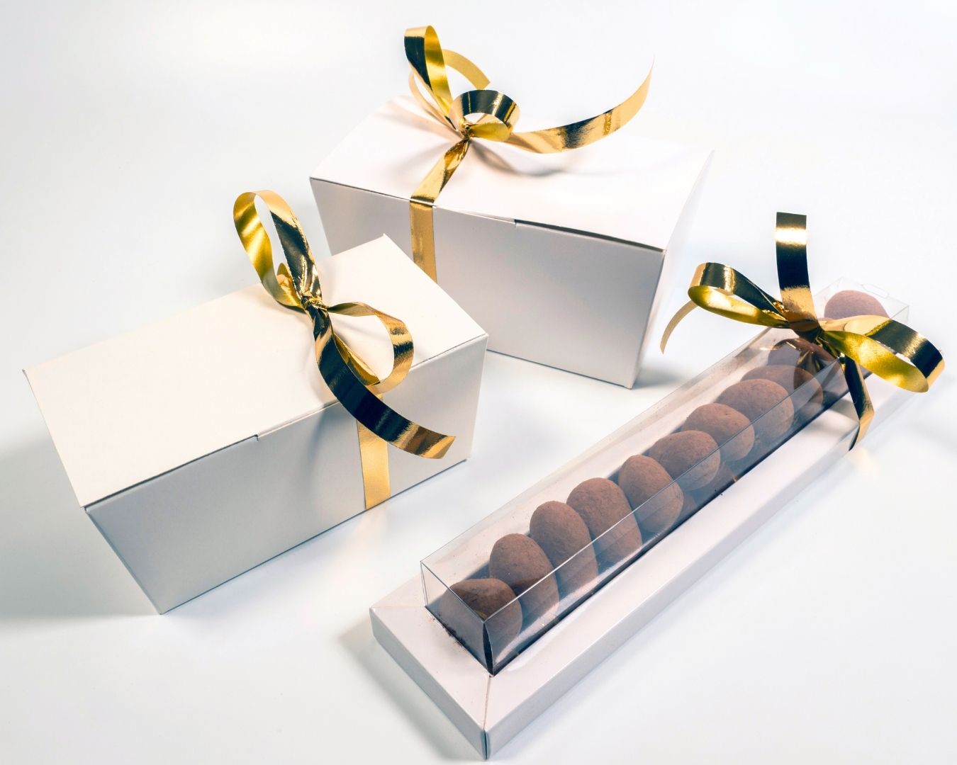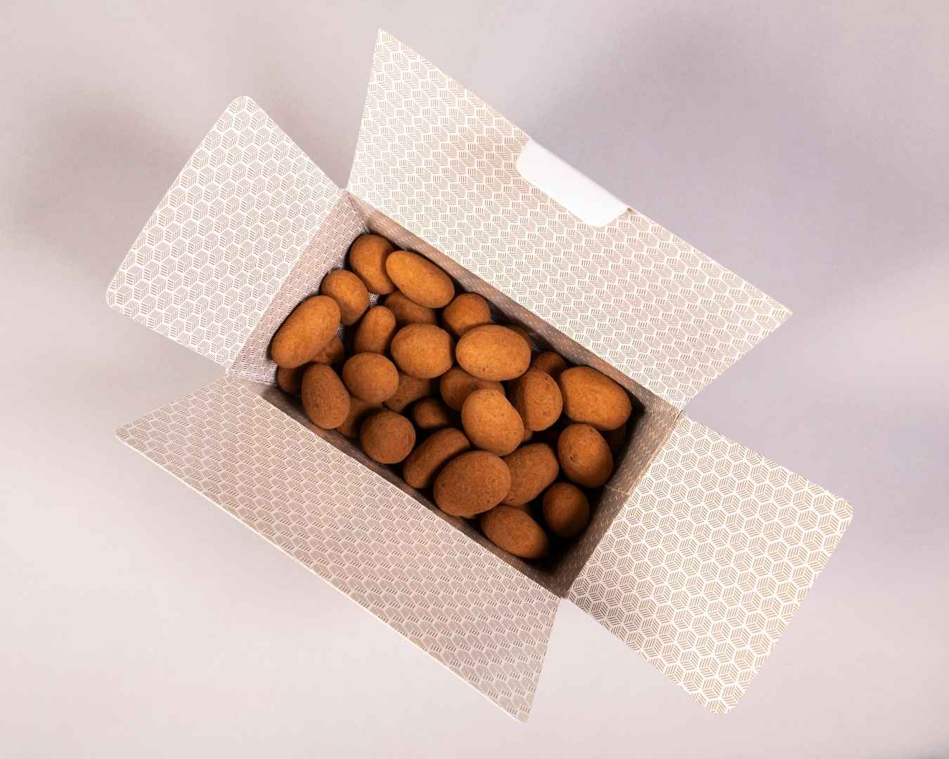 Ametlles caramel·litzades recobertes de xocolata blanca i empolsades amb cacau.