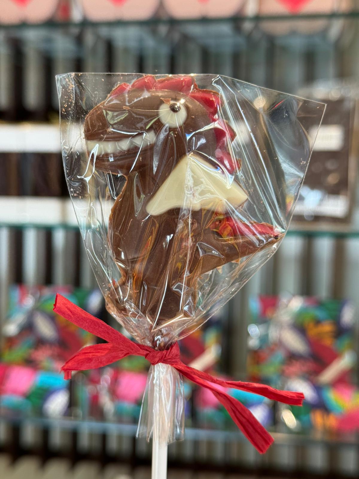 Piruleta de xocolata en forma de drac (xocolata amb llet i blanca).