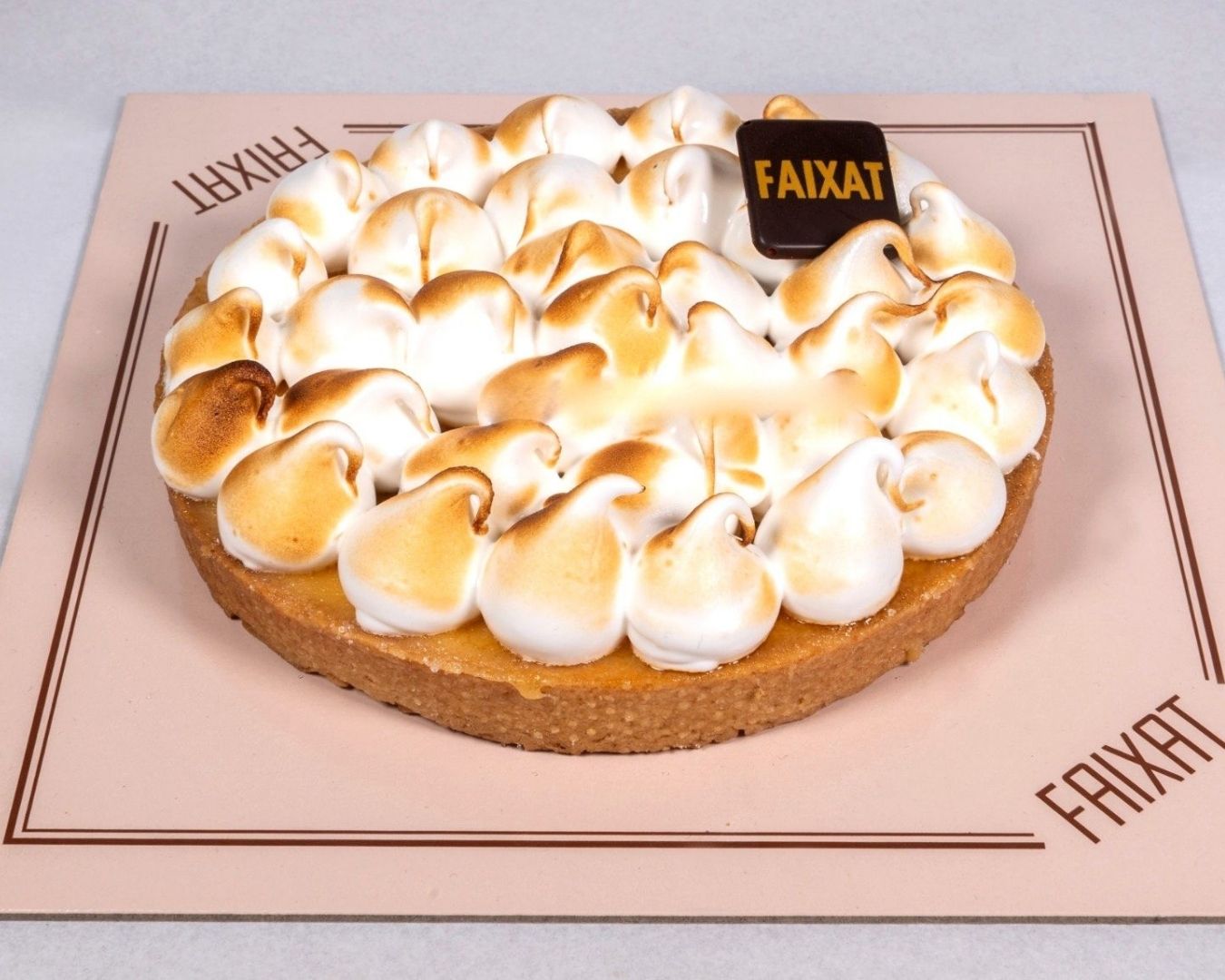 Base de pasta brisée (tipus galeta) amb interior de crema de llimona i decorat amb merenga.
