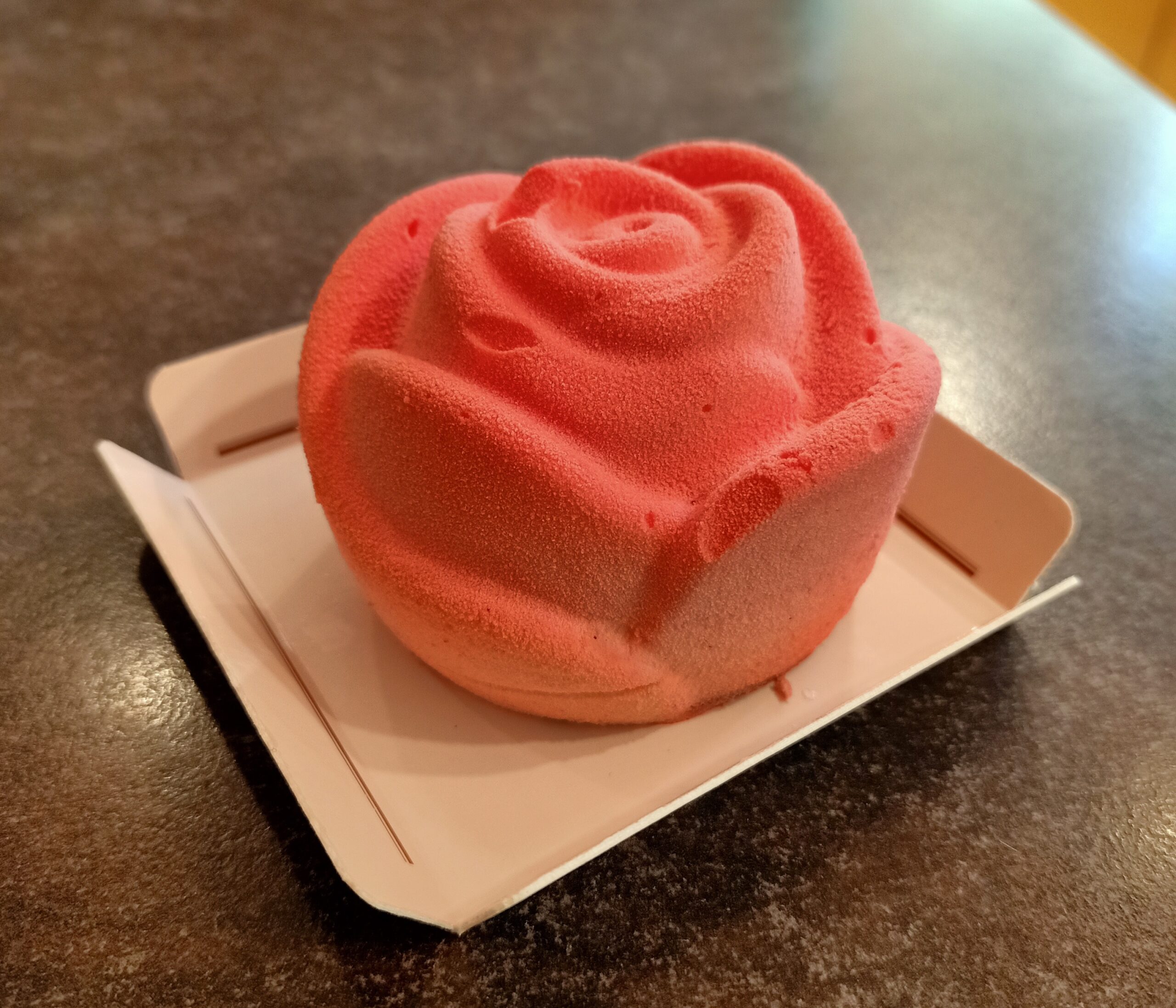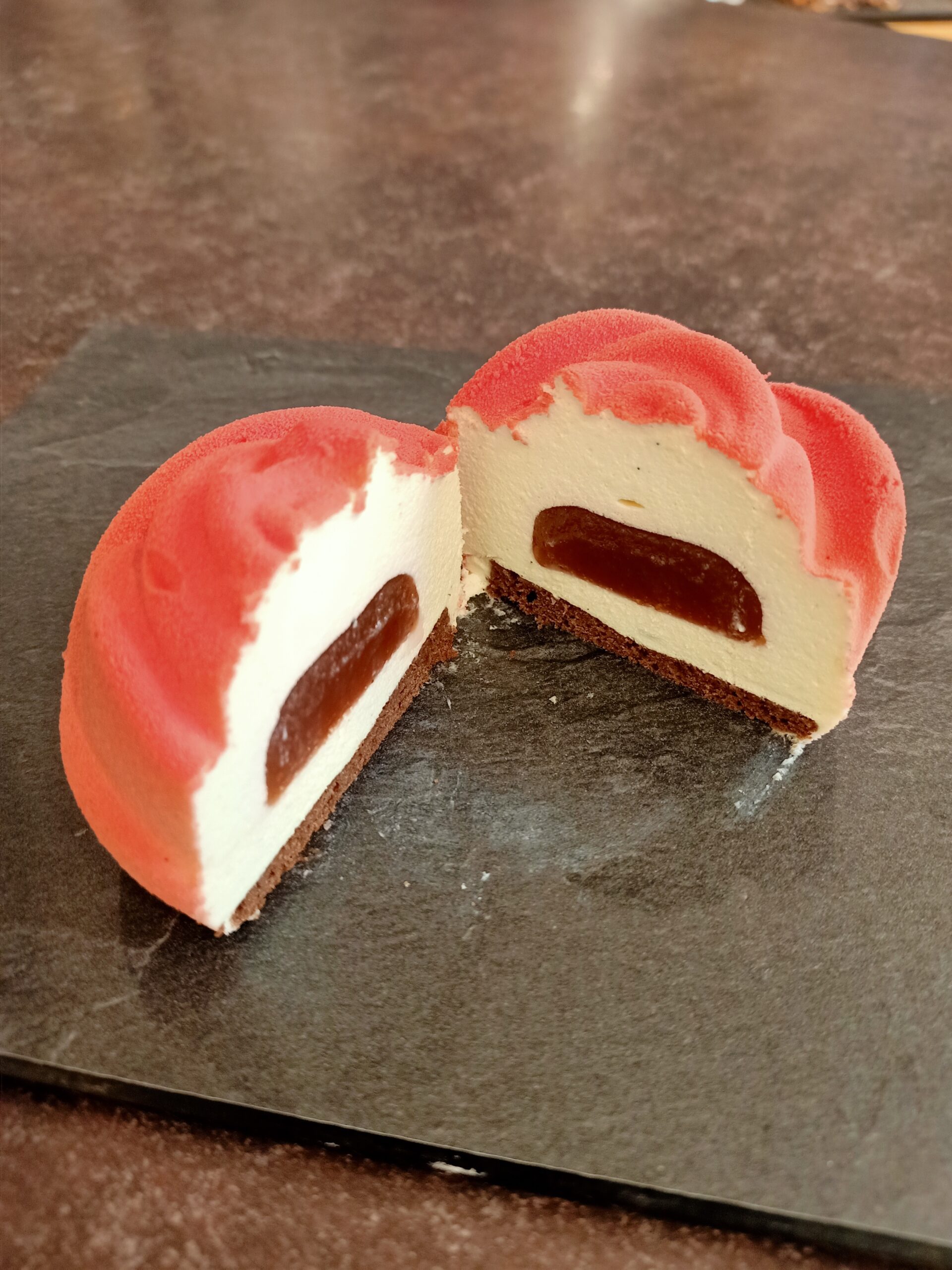 Postres individuals en forma de rosa de mousse de vainilla de Madagascar, amb un interior de maduixa i alfàbrega.