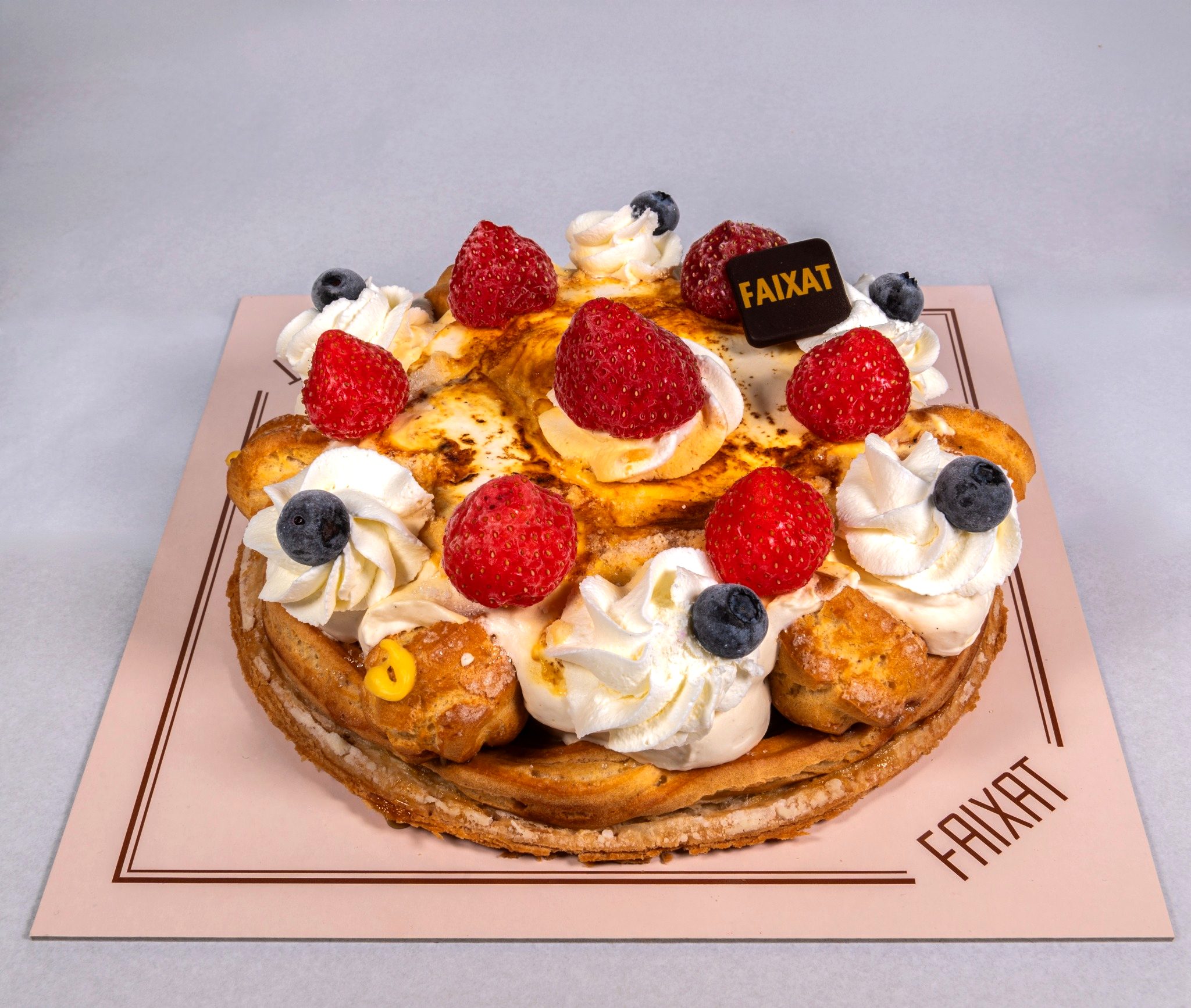 Pasta choux (tipus lionesa) amb crema i nata. Decorat amb profiterols de crema i maduixots. Mides: petit per 4-5 persones, mitjà per 6-7 persones i gran per 8-9 persones.